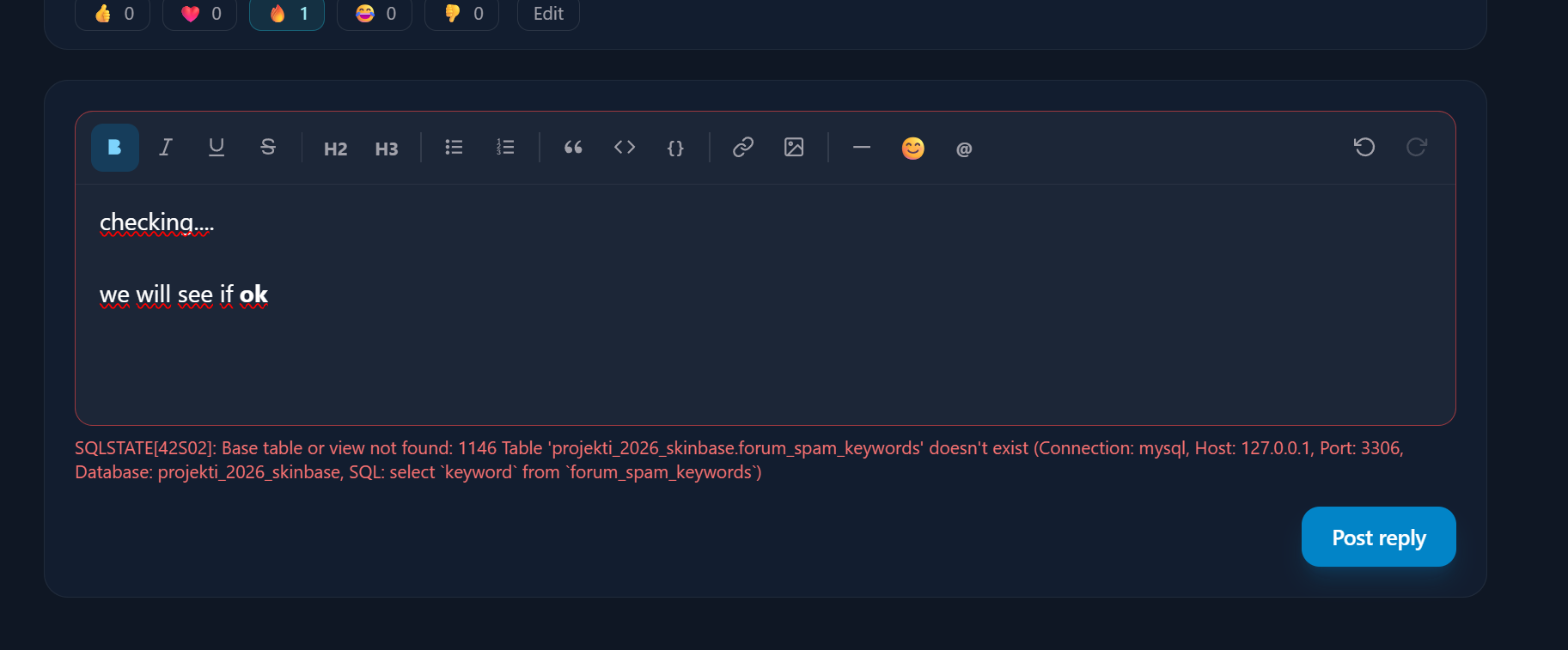 SQLSTATE[42S02]: Base table or view not found: 1146 Table 'projekti_2026_skinbase.forum_spam_keywords' doesn't exist (Connection: mysql, Host: 127.0.0.1, Port: 3306, Database: projekti_2026_skinbase, SQL: select